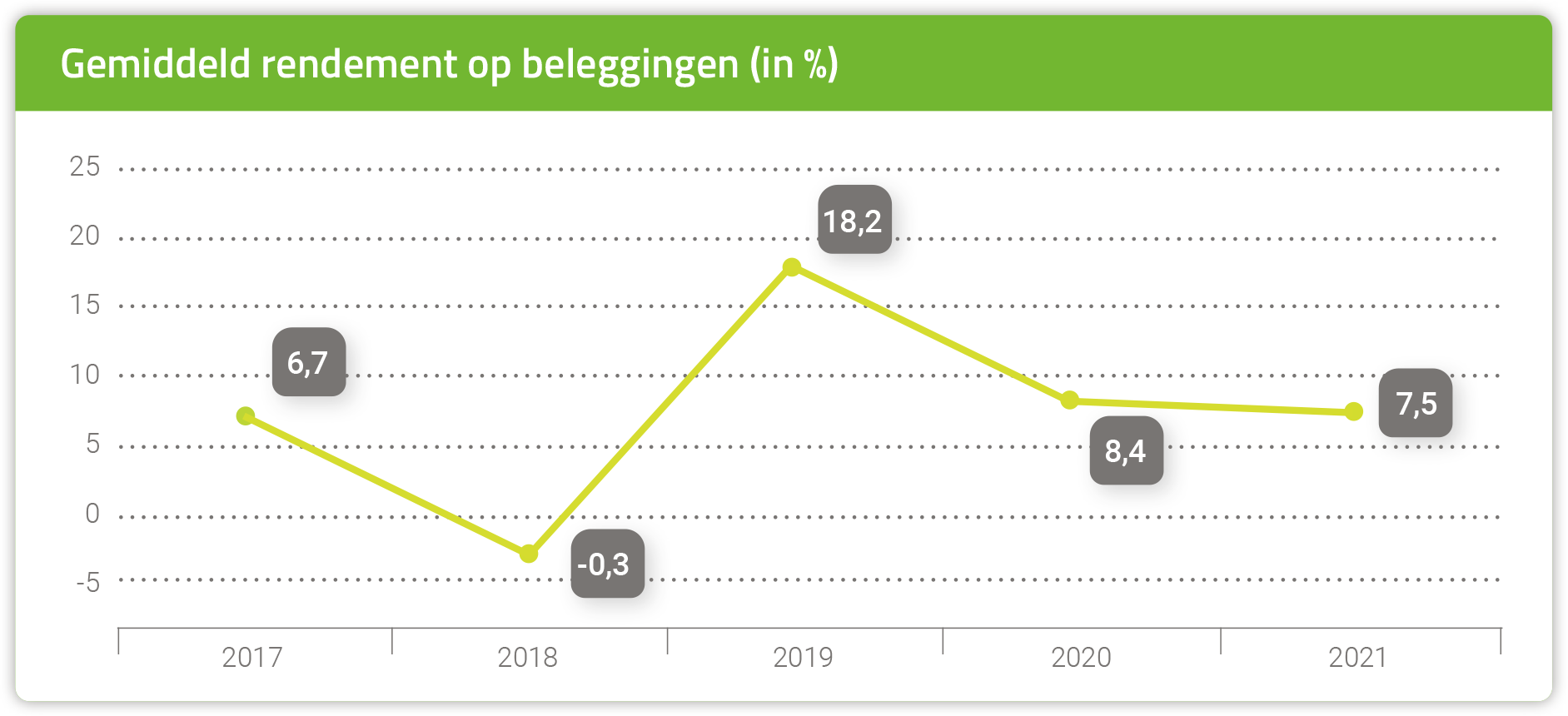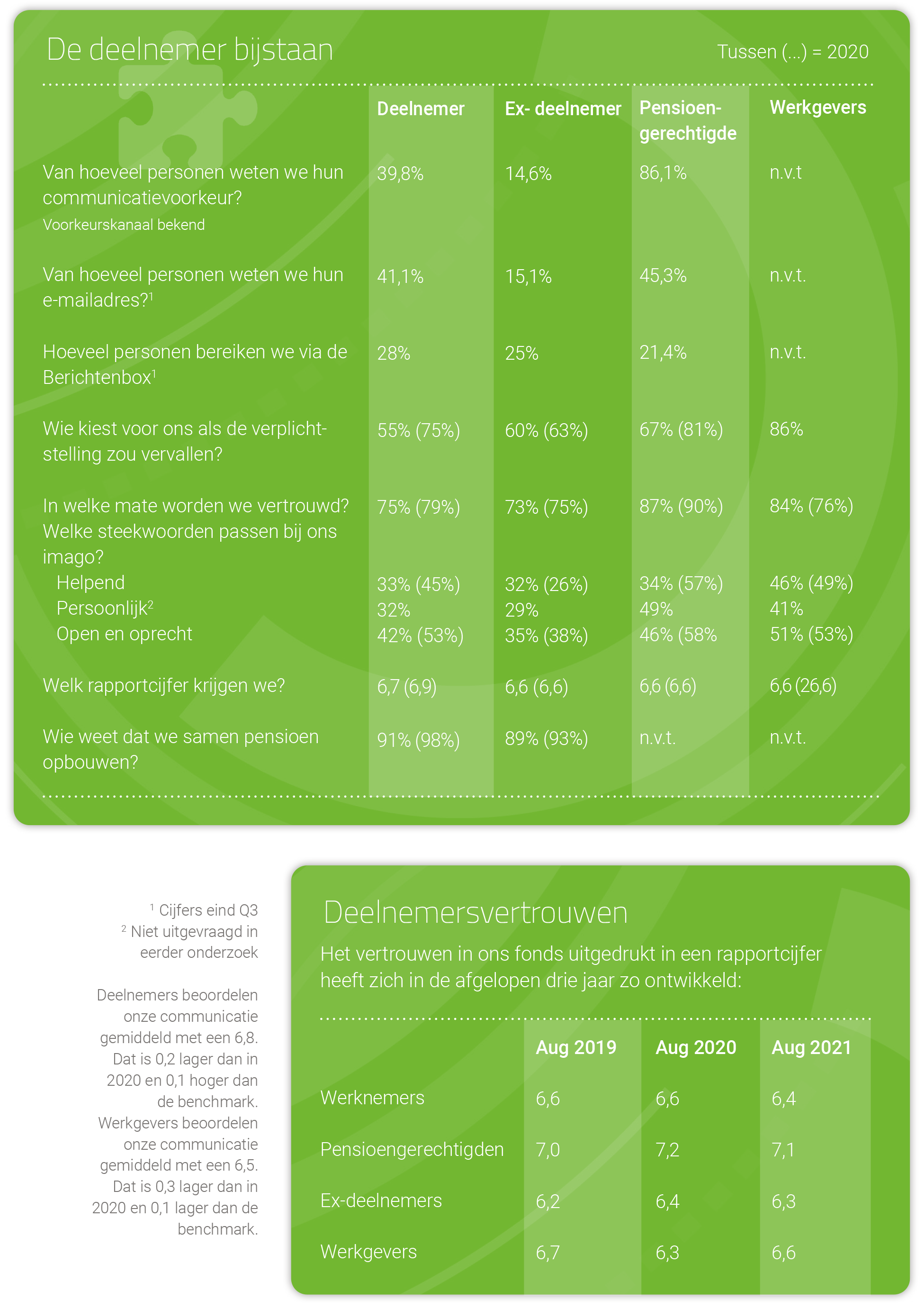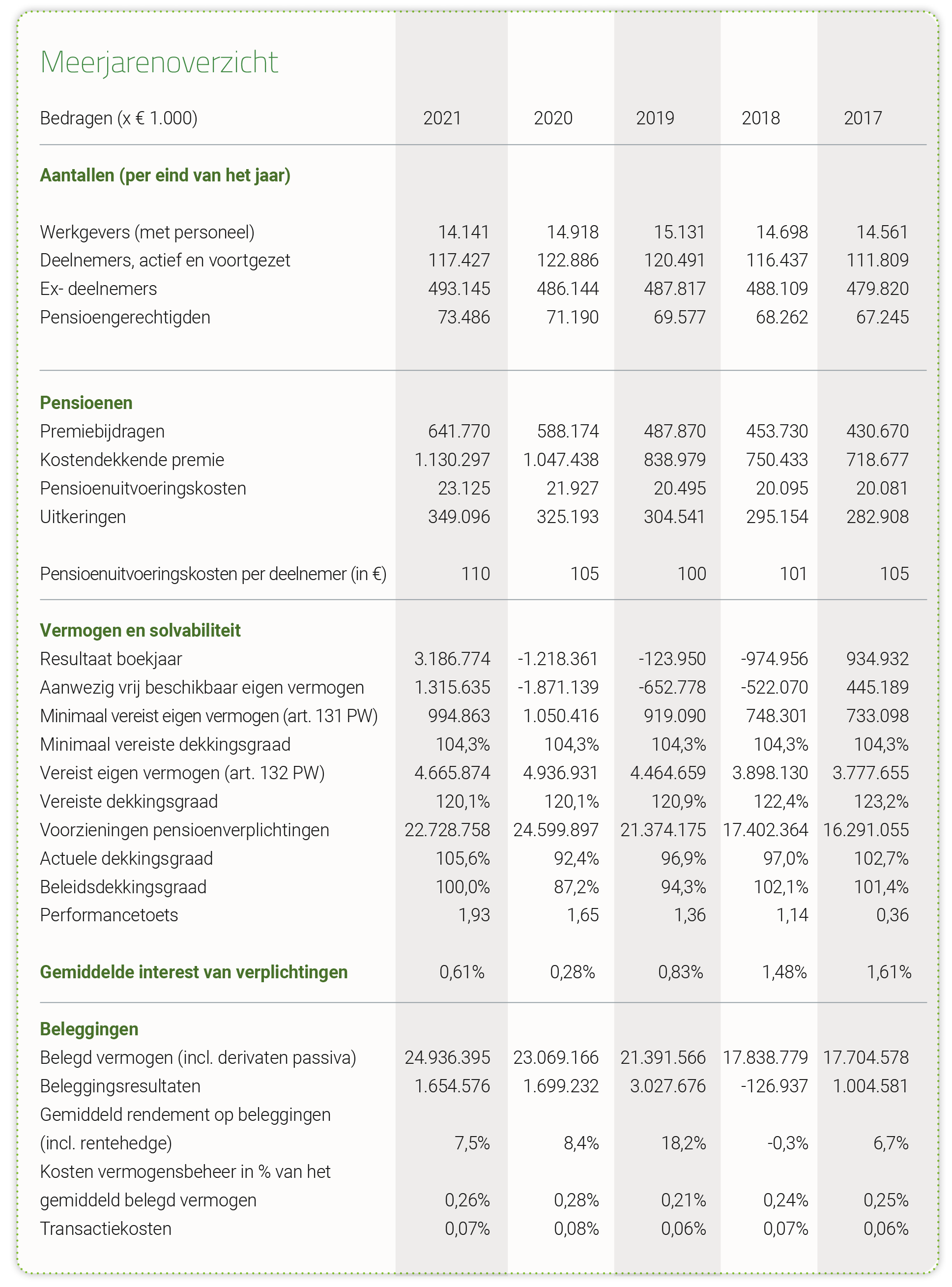 Tenslotte hebben we ook in 2021 veel energie gestoken in het bijstaan van onze deelnemers. Met communicatie en met dienstverlening op het juiste moment. Helaas zien we dat in 2021 niet terug in de waardering en het vertrouwen van onze deelnemers. Die is iets gedaald. Daarom zullen we ons in 2022 extra inspannen om het vertrouwen weer te laten stijgen. Want we vinden het belangrijk dat onze deelnemers en werkgevers zich bij ons thuis voelen.