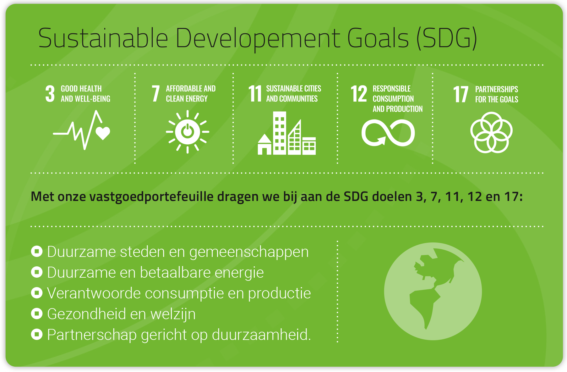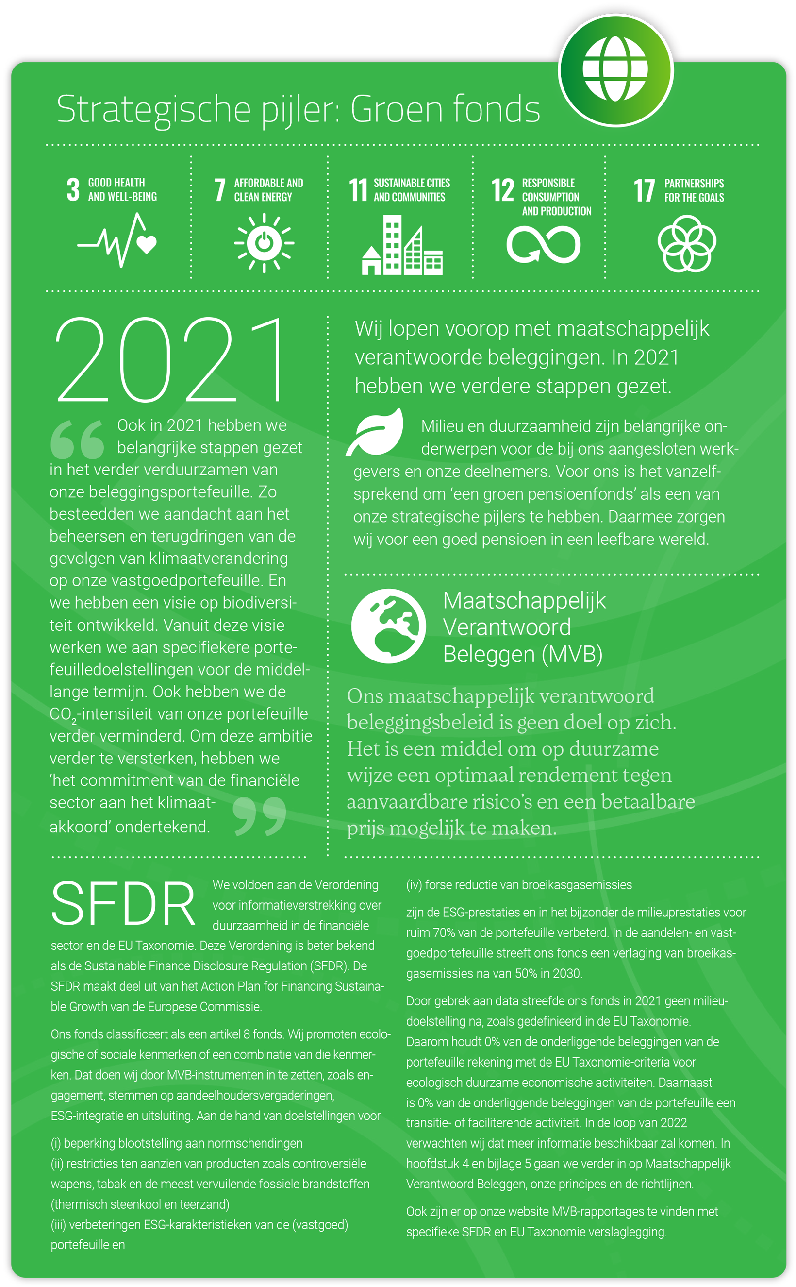 Omdat het onze ambitie is een goed pensioen te verzorgen in een leefbare wereld, zijn en blijven we een groen fonds. Thema’s die ook belangrijk zijn voor de agrarische sectoren, zie je terug in ons beleggingsbeleid: verantwoord ondernemen, samenleving en het klimaat.