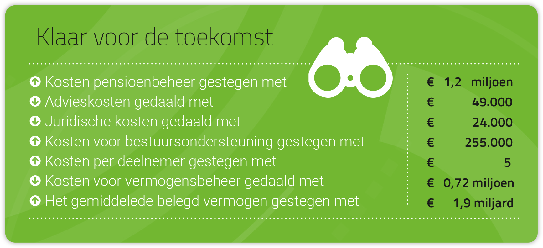 Gezamenlijk werken we aan de doelstellingen die gebaseerd zijn op onze vier strategische pijlers en randvoorwaarden om in controle te zijn: 1. De deelnemers bijstaan; 2. We zijn een groen fonds; 3. Klaar voor de toekomst; 4. De werkgever bijstaan; 5. We zijn in controle.