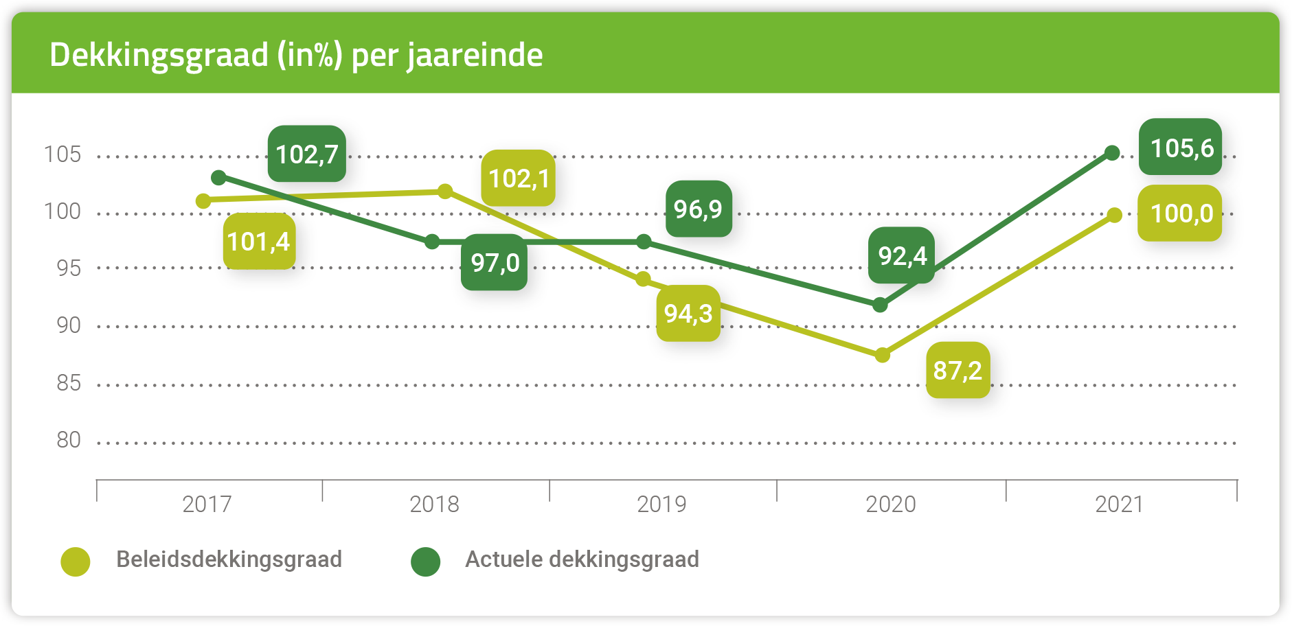 In 2021 is onze financiële positie verbeterd. Dat is goed nieuws, hoewel we nog niet uit de zorgen zijn. In 2021 is onze beleidsdekkingsgraad iedere maand iets gestegen. En dat herstel zet door. Daardoor kunnen wij sinds kort weer waardeoverdrachten doen. Ook hoeven wij in 2022 de pensioenen niet te verlagen. Dit komt omdat de actuele dekkingsgraad in 2021 gestegen is van 92,4% naar 105,6%. Dat is helaas nog niet goed genoeg om onze pensioenen te verhogen. Daarvoor moet het herstel zich nog langer voortzetten.