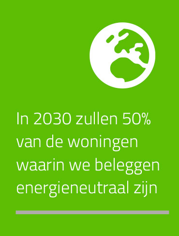 We willen met ons beleid voorop lopen. Dan dragen onze beleggingen echt bij aan een leefbare wereld (download pdf). Daarom willen we dat in 2030 50% van de woningen waarin we beleggen energieneutraal zijn. En dat de uitstoot van CO2 in onze woningportefeuille in 2030 gehalveerd is. Daar waren we halverwege 2021 al heel ver mee. Toen hadden we al een reductie van 38% bereikt!
